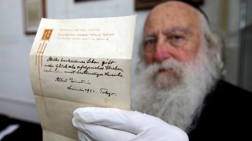 Una nota manuscrita en la que Albert Einstein explica cómo vivir una vida feliz fue adjudicada este martes en Jerusalén en 1,56 millones de dólares, informó la casa de subastas.