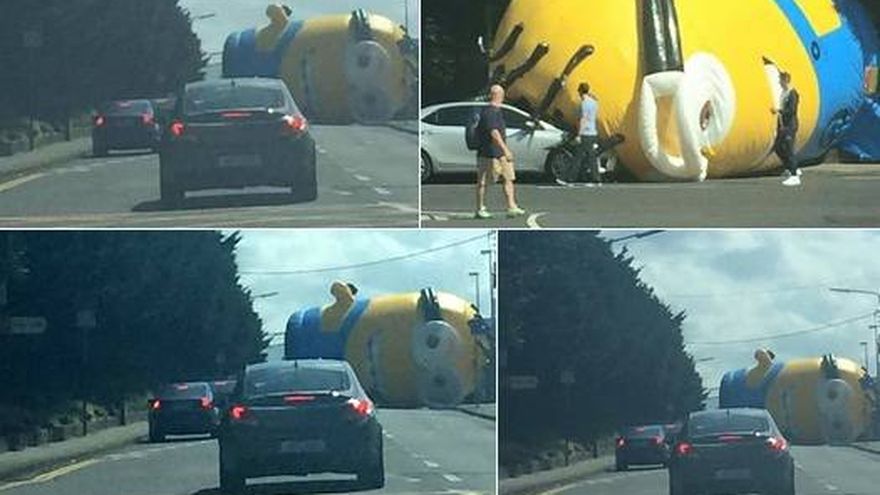 Un Minion inflable de tamaño extra grande provocó un accidente de tránsito en Irlanda, en una foto tan curiosa que da la vuelta al mundo vía redes sociales.