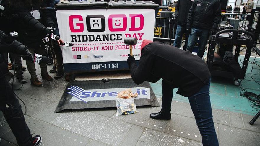 Los neoyorquinos se estaban deshaciendo de los malos recuerdos del 2016 en el "Good Riddance Day", una ceremonia simbólica en la que se apuntan las ideas negativas en un papel y se destruyen en una trituradora gigante en Times Square.