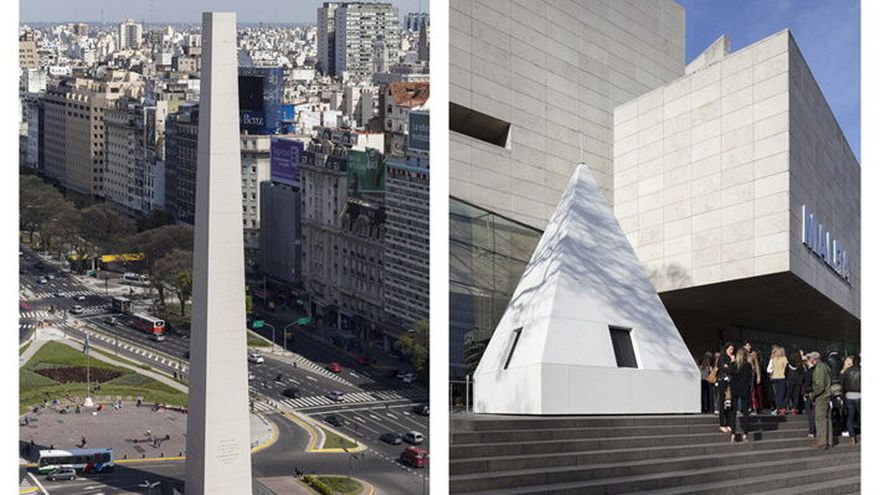 La punta al cielo del monumento más emblemático de la ciudad apareció el domingo ni más ni menos que en la explanada del Museo de Arte Latinoamericano de Buenos Aires (Malba), a cuatro kilómetros de su lugar original, y con la posibilidad de entrar y mirar por las ventanas como si estuviera de verdad a 70 metros de altura.