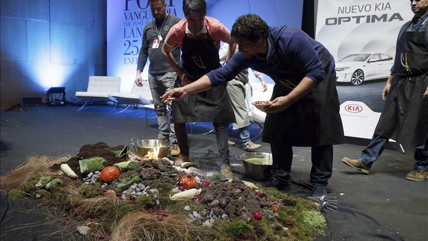 Un montón de tierra sobre el escenario cubriendo alimentos y focos de calor. Virgilio Martínez, Jorge Vallejo y Mauro Colagreco han recuperado técnicas de cocción ancestrales de Perú, México y Argentina, además de productos casi extinguidos, y hoy los presentaron en Madrid Fusión.