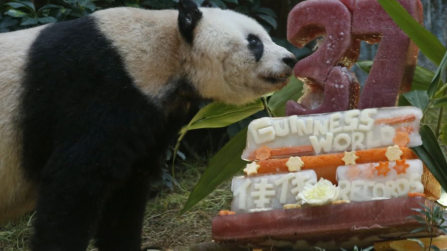 La osa panda en cautividad más vieja del mundo probó una tarta elaborada con vegetales congelados y, por supuesto, bambú en la celebración de su 37mo aniversario.