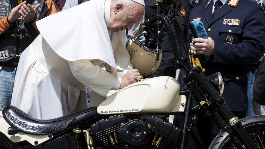 Además, trajeron una Harley Davidson especialmente personalizada en honor del pontífice, que no dudó en dar el toque final estampando su firma "Franziskus" sobre el depósito.