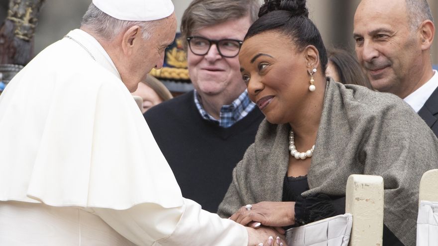 El papa Francisco saludó brevemente al cineasta estadounidense Michael Moore y a la activista Bernice Albertine King, hija menor de Martin Luther King, al termino de la audiencia general de hoy celebrada en la Plaza de San Pedro.