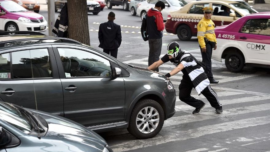 Arriba, sobre el asfalto de la caótica capital, un fuerte hombre de 28 años se cubre el rostro con una máscara típica de la lucha libre mexicana, esgrimiendo una señal de tránsito mientras ondea su capa de líneas blancas y negras, que representan un cruce peatonal.