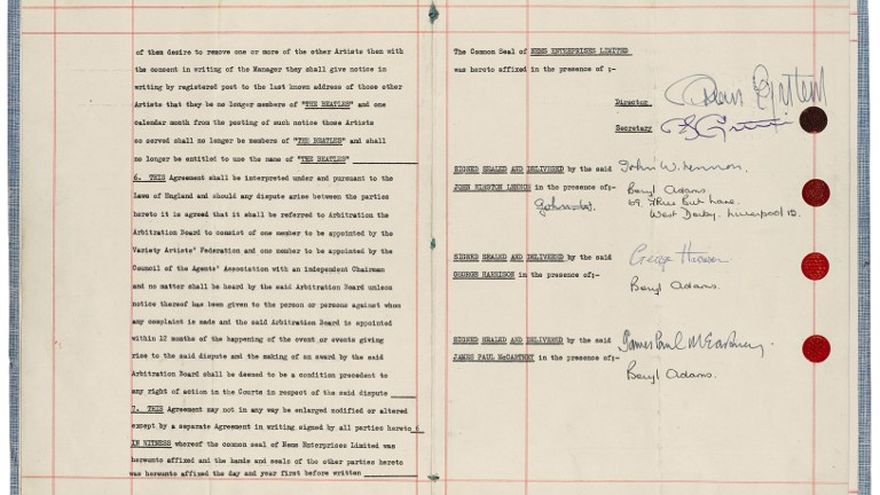 La banda inglesa -integrada entonces por John Lennon, Paul McCartney, George Harrison y Peter Best en la batería- había firmado este contrato en 1961 en Hamburgo, Alemania, cuando todavía era desconocida.