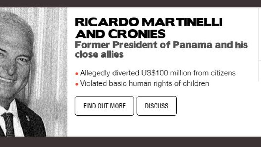 El expresidente de Panamá, Ricardo Martinelli Berrocal, se encuentra en el cuarto puesto en el ranking de votación del concurso “Desenmascara al Corrupto” (Unmask the Corrupt”); una campaña que fue lanzada en octubre por Transparencia Internacional (TI).