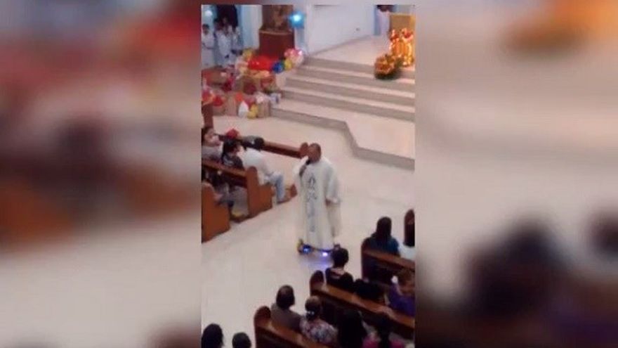 El vídeo, publicado por un grupo religioso en su página de Facebook, muestra cómo el cura se traslada por el pasillo central de la iglesia montado en el artefacto de dos ruedas, mientras sujeta un micrófono y hace los cánticos de la homilía.
