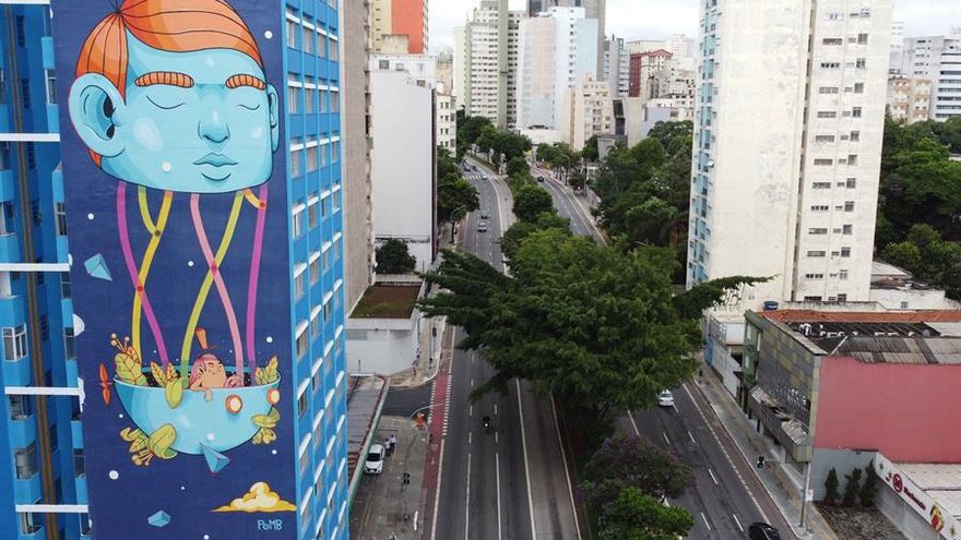 Pinta con el mismo esmero un muro de 35 metros de altura, como un cuadro al óleo. El color azul le inspira y el español Francisco de Goya es una de sus referencias artísticas. Se llama Thales Fernando "Pomb", tiene 31 años y forma parte de la inagotable cantera de grafiteros brasileños.
