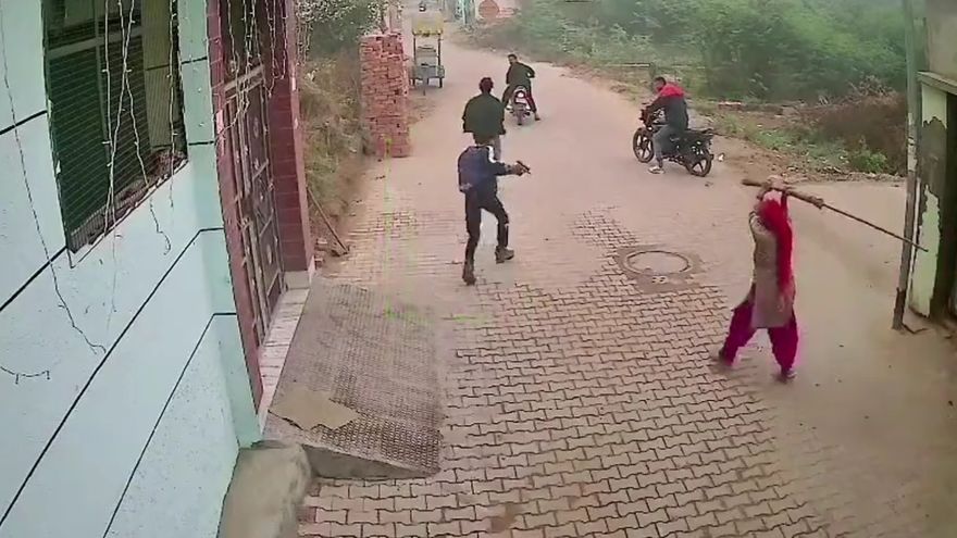 La arriesgada acción de una mujer en India le está dando la vuelta al mundo después que ahuyentara a unos criminales armados que asaltaron a un hombre en el portal de su casa. Según reportaron medios locales y tal como se ve en un video grabado por una cámara de seguridad, cuatro sujetos en moto abrieron fuego a mansalva contra un hombre que se encontraba parado afuera de su vivienda. En medio de la balacera, el hombre intenta refugiarse dentro de la residencia cuando se ve como una señora irrumpe en la escena con un palo de escoba, tratando de espantar a los delincuentes. Lo inaudito del asunto es que la valiente mujer logró que los ladrones salieran despavoridos.