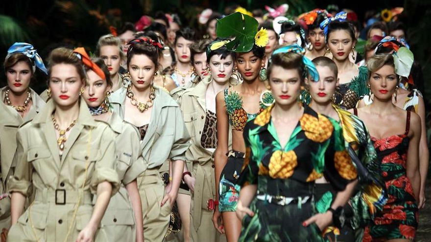 Los diseñadores proponen sus habituales vestidos entallados negros inspirados en la tradición siciliana acompañados esta vez con sensuales calcetines cortos, junto con una variedad infinita de estampados con cebras, tucanes, papagayos, jirafas, leopardos, pero también sandías, piñas y sobre todo enormes hojas en faldas amplias, camisas, vestidos o brillantes trajes de chaqueta.