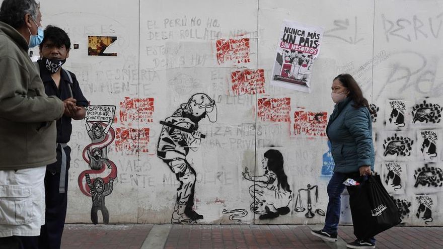 En una esquina de la histórica plaza de San Martín, en tinta negra, bajo un fondo gris, la sentencia "se equivocaron de generación" invita al transeúnte a fijar su mirada en los muros del jirón Quilca, una de las céntricas calles del casco histórico limeño, repleta de lienzos improvisados, que respiran tanta indignación como ingenio.