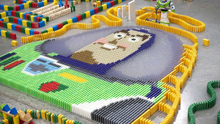 Una estructura hecha con 32 mil piezas de dominó y otros elementos que cayeron en cadena a lo largo de casi cinco minutos antes de desplomarse ordenadamente rindió homenaje al nuevo parque Toy Story Land de Disney en Orlando (Florida, EE.UU.).