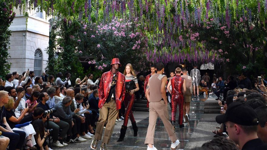 La colección también incluyó piezas para mujeres, como el vestido entallado con flores en pedrería que vistió la modelo Kendall Jenner u otros minúsculos en cuero negro y vistosos volantes.