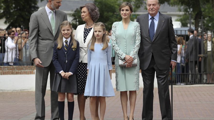 Unos pasos más atrás, los acompañaban el rey Juan Carlos y la reina Sofía, quienes conversaron sonrientes antes de sumarse a Felipe VI y Letizia y sus hijas para la foto de familia ante la prensa gráfica.