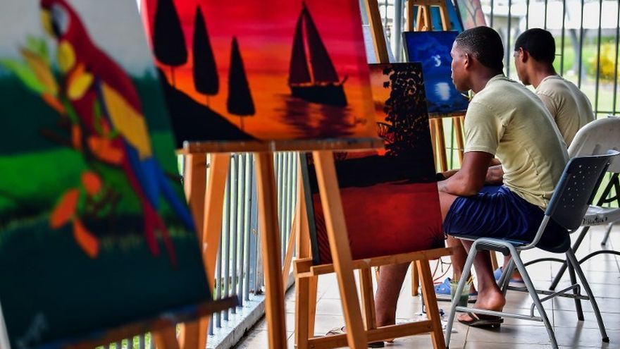 "Tengo un par (de reclusos) que, según la seguridad, son problemáticos, pero cuando llegan acá es otra cosa, agarran el lienzo y pasan horas pintando, se quedan ahí con una concentración increíble", señala Sharito Moreno, quien enseña a los detenidos a pintar con óleo, acrílico y acuarela.