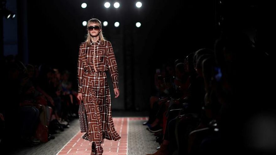 La sofisticación de la seda marrón impresa con el logo blanco convivió con el toque descarado de los conjuntos estampados con billetes de 500 francos y las deportivas franjas verticales en blanco, marrón y marino.