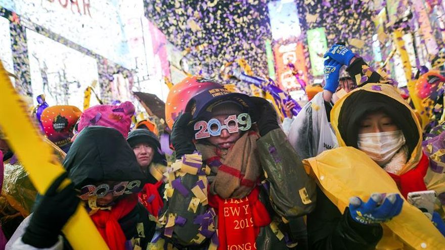 Miles de personas despidieron hoy bajo la lluvia 2018 y dieron la bienvenida a 2019 en la emblemática plaza de Times Square de Nueva York, acompañados de una colorida nube de confeti y del descenso de la icónica bola de cristal de más de 5 toneladas.