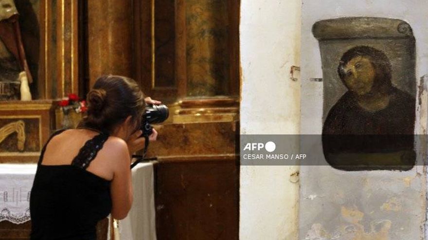 La cabellera con aspecto de pelaje de mono, la boca difuminada y la nariz mal perfilada nacidas de los pinceles de esta restauradora aficionada no tenían nada que ver con el original: un 'Ecce Homo' de trazos finos con una corona de espinas pintado por Elías García Martínez en la década de 1910.
