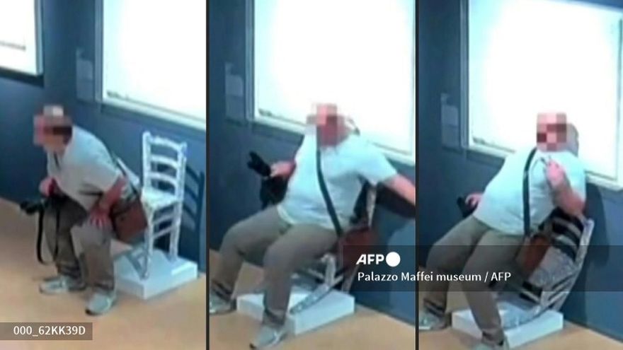 El jueves el museo publicó un video de sus cámaras de seguridad en las que aparece un turista sentado en esta obra de arte mientras una mujer le saca fotos. Al sentarse, la silla se desploma.