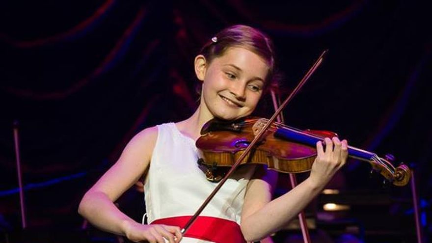 Ataviada con un vestido floreado, la niña acompaña al piano a los solistas que la triplican en edad.