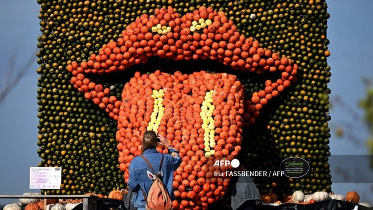 Los visitantes observan una exhibición que muestra el logo de los Rolling Stones frente a una lengua en una exposición de calabazas con temática musical en el Krewelshof cerca de Mechernich, Alemania occidental, el 16 de octubre de 2024. / AFP