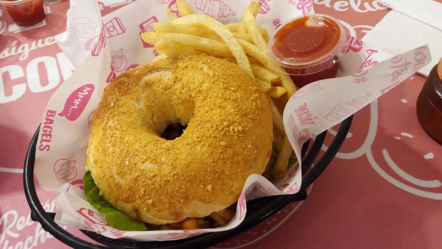 Entre los bagels se puede elegir entre el pan parmesan and garlic, tomate y albahaca, orégano y el llamativo “rainbow bagel”, elaborado con colores vegetales.