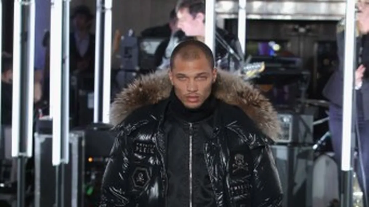 El modelo vistió unos pantalones negros brillantes y un chaquetón del mismo color con una gran capucha con bordes de pelo, aunque también posó entre bastidores con su esculpido torso al descubierto, en el que sus numerosos tatuajes reforzaron su imagen de "chico rebelde".