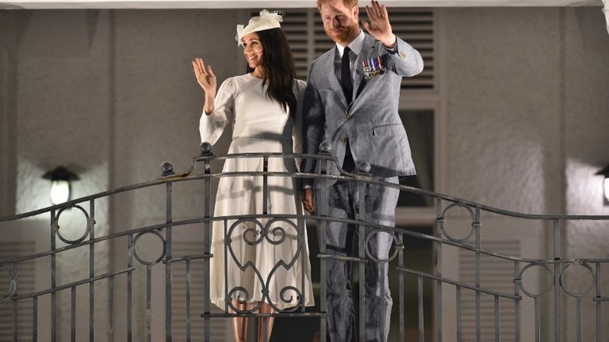 El príncipe Enrique y Meghan Markle saludan desde el balcón del Grand Pacific Hotel en Fiyi / AFP