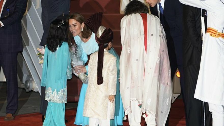 La pareja británica --él con traje oscuro, ella con vestido largo y pantalones color turquesa-- fue recibida por el ministro de Relaciones Exteriores paquistaní, Shah Mehmood Qureshi, al descender de un avión en una base militar en Rawalpindi, guarnición contigua a Islamabad, según informó la televisión pública.