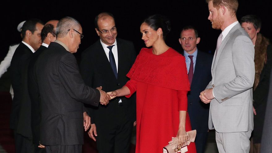 A su llegada, el príncipe Enrique, en traje gris claro, y la duquesa de Sussex, con un vestido rojo, fueron recibidos con una tradicional bandeja de dátiles, una muestra de hospitalidad en Marruecos.