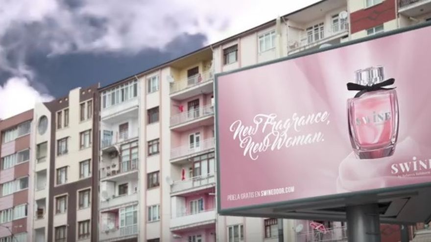 La RAE expone en su campaña a una mujer promocionando una fragancia con el nombre de “Swine”, con mucha sensualidad pasa la fragancia por su cuerpo pensando que es lo mejor del mercado, sin imaginar que lo que promociona y se coloca en su figura significa “cerdo” en español. Es decir que quienes se le acerquen olerán a una mujer como huele un cerdo, “suena muy bien, pero huele muy mal”.
