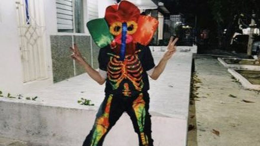 En una de las fotografías virales en redes sociales se la ve sentada en el bordillo de una calle con la típica máscara de la marimonda, un personaje burlesco con rasgos de elefante y primate.