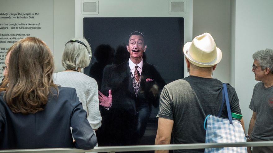 "Un, dos y tres", Salvador Dalí sonríe al tiempo que se hace un selfi con los visitantes al museo en su honor de St. Petersburg, en Florida (EE. UU.), que se asombran del nuevo homenaje al genial pintor español: una representación virtual casi tan excéntrica como el original.