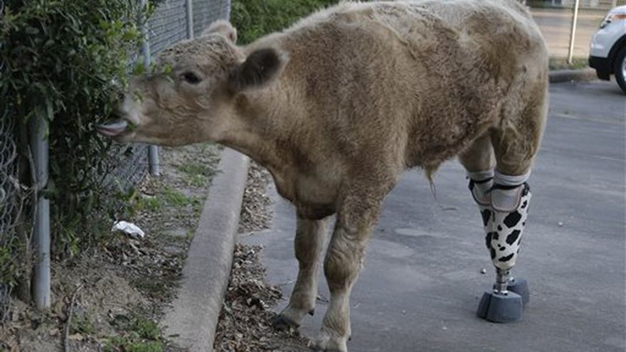 Técnicos que fabricaron los remplazos para los cascos y las patas y un cirujano de la universidad Texas A&M que atendió al animal a principios de este año dijeron que no sabían de otro ternero que llevara prótesis en las piernas.