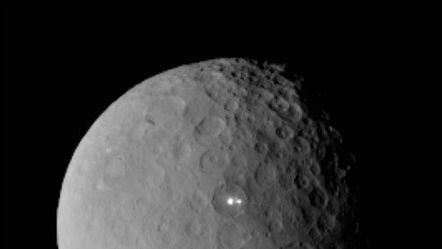 La sonda ha enviado imágenes enigmáticas de Ceres antes de llegar, donde aparecen dos áreas brillantes dentro de uncráter que podrían corresponder a concentraciones de hielo o de sal.