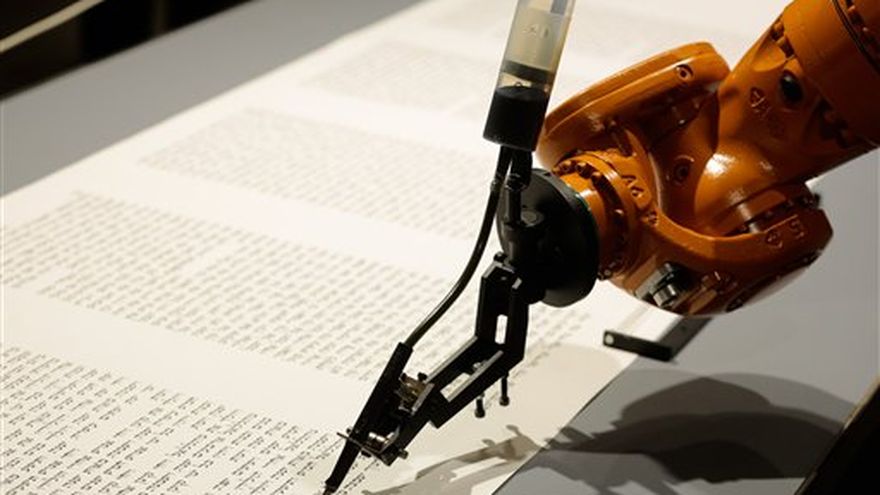 La pluma del robot corre sobre el rollo de papel de derecha a izquierda, anotando letras hebreas con tinta negra. Está reproduciendo la Torá, las sagradas escrituras hebreas, con mucha mayor rapidez que un rabino porque no necesita descansar.