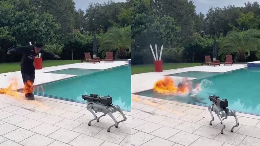 Sin embargo, las cosas no salieron según lo planeado. Al intentar hacer que el perro robot ladrara, el dispositivo, en lugar de seguir la orden, lanzó una potente llamarada que alcanzó los pantalones de Speed, prendiéndolos fuego. En un momento de alta tensión, el streamer reaccionó rápidamente, saltando a la piscina cercana para extinguir las llamas, mientras el equipo de bomberos se aseguraba de que no hubiera daños mayores.