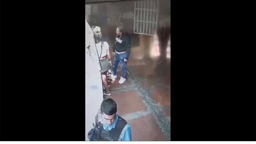 Se puede observar cuando la víctima llevaba una maleta azul y una cartera y llega una delincuente de falda negra y blusa blanca e intenta quitarle lo que tiene en las manos. Segundos después, su cómplice arriba a la escena para aterrorizar a la mujer con un cuchillo grande. Justo en ese momento un guardia de seguridad pasa muy cerca de ellas tres se queda viendo el robo y se retira sin prestar ayuda alguna. Finalmente, lograron despojar a la mujer de sus pertenencias, la golpearon y huyeron, dejándola tumbada en el suelo.