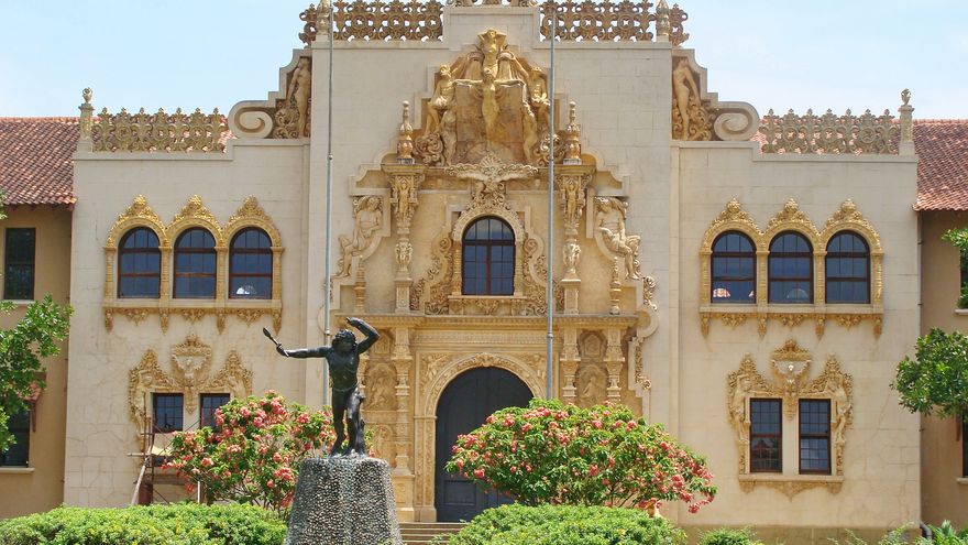 En su parte frontal su entrada se encuentra custodiada por dos (2) leones tallados por Luis Cacelli (escultor italiano), el vestíbulo por cuatro águilas talladas en la parte superior del vestíbulo.