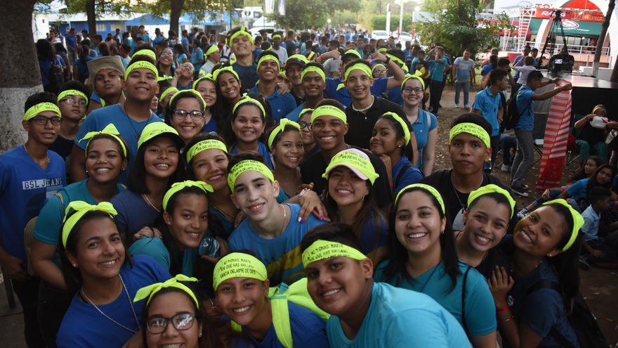 La tarde de este jueves 25 de enero, aproximadamente 2,500 jóvenes vestidos de color azul y con pancartas representativas a su comunidad brincaban de emoción al escuchar por parte de los organizadores del encuentro la frase: "Bienvenidos al Encuentro Nacional de Renovación Juvenil 2018".