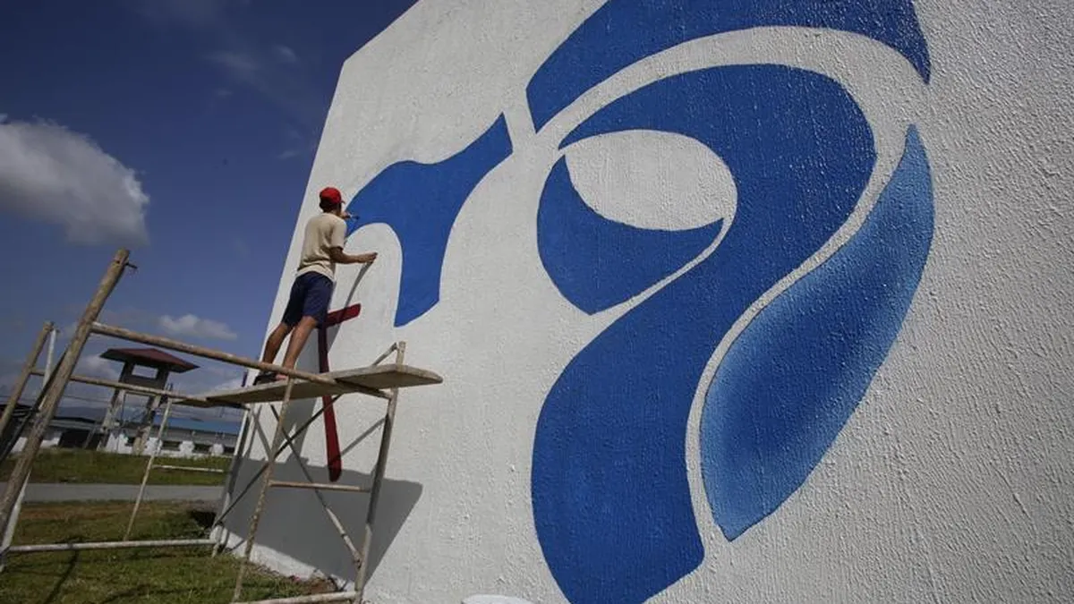 Fernando, detenido desde hace tres años por intento de homicidio pero a punto de salir en libertad, se cubre la cabeza con una camiseta para resguardarse del sol mientras pinta el logotipo de la JMJ en una de la paredes de la capilla.