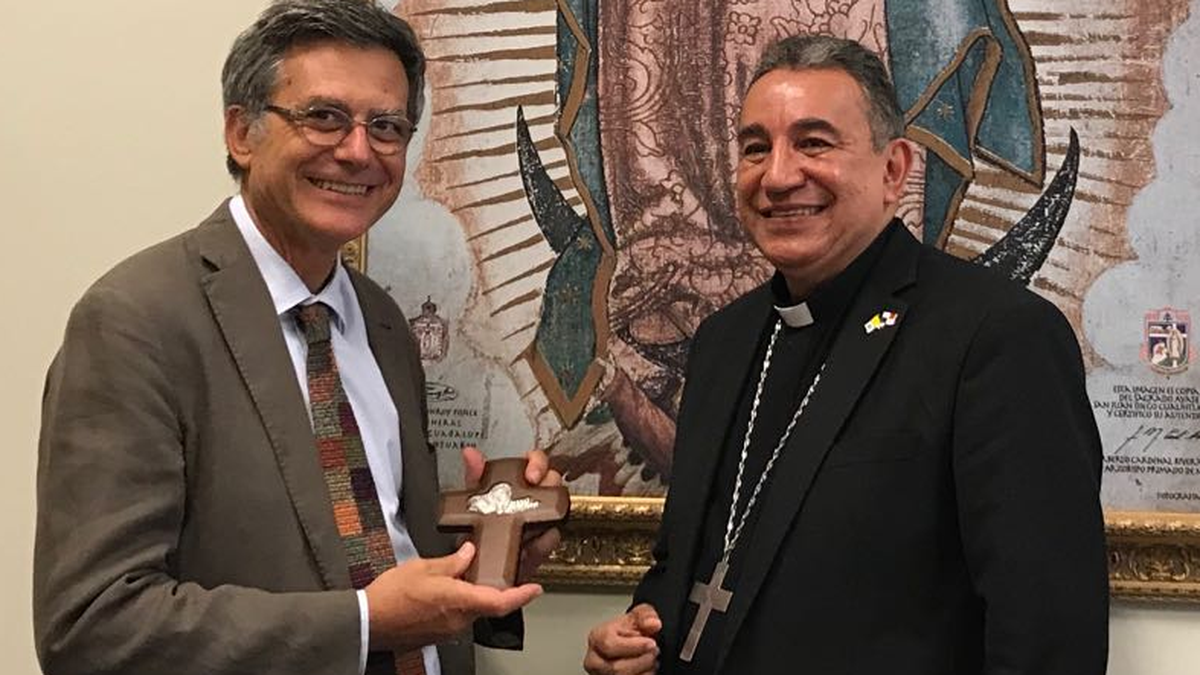 Ulloa aprovechó el momento para entregar a Ruffini una cruz con el logo de la JMJ Panamá 2019, tal como informó la Arquidiócesis de Panamá.