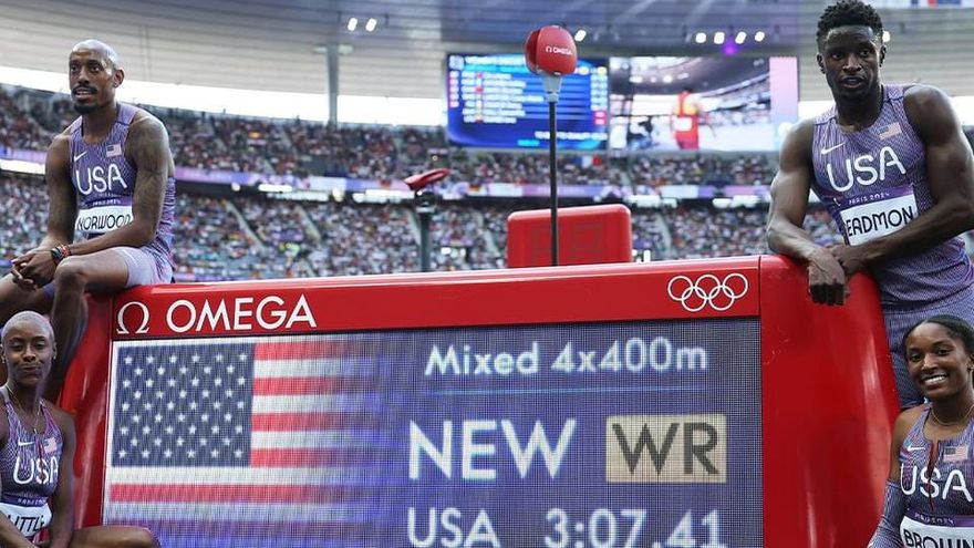 Francia/Estados Unidos batió el récord del mundo del relevo 4x400 metros mixto de atletismo en las series de acceso a la final, este viernes en los Juegos Olímpicos de París, con un crono de 3 minutos 7 segundos 41 centésimas.