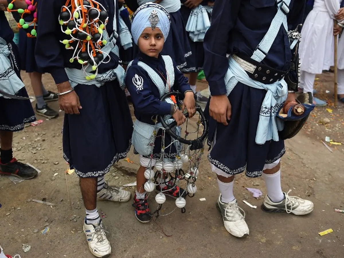 Niños indios sijs participan en una procesión religiosa en Nueva Delhi el 24 de noviembre de 2015, para celebrar el aniversario del nacimiento del primer Sikh Guru o maestro, Sri Guru Nanak Dev Ji