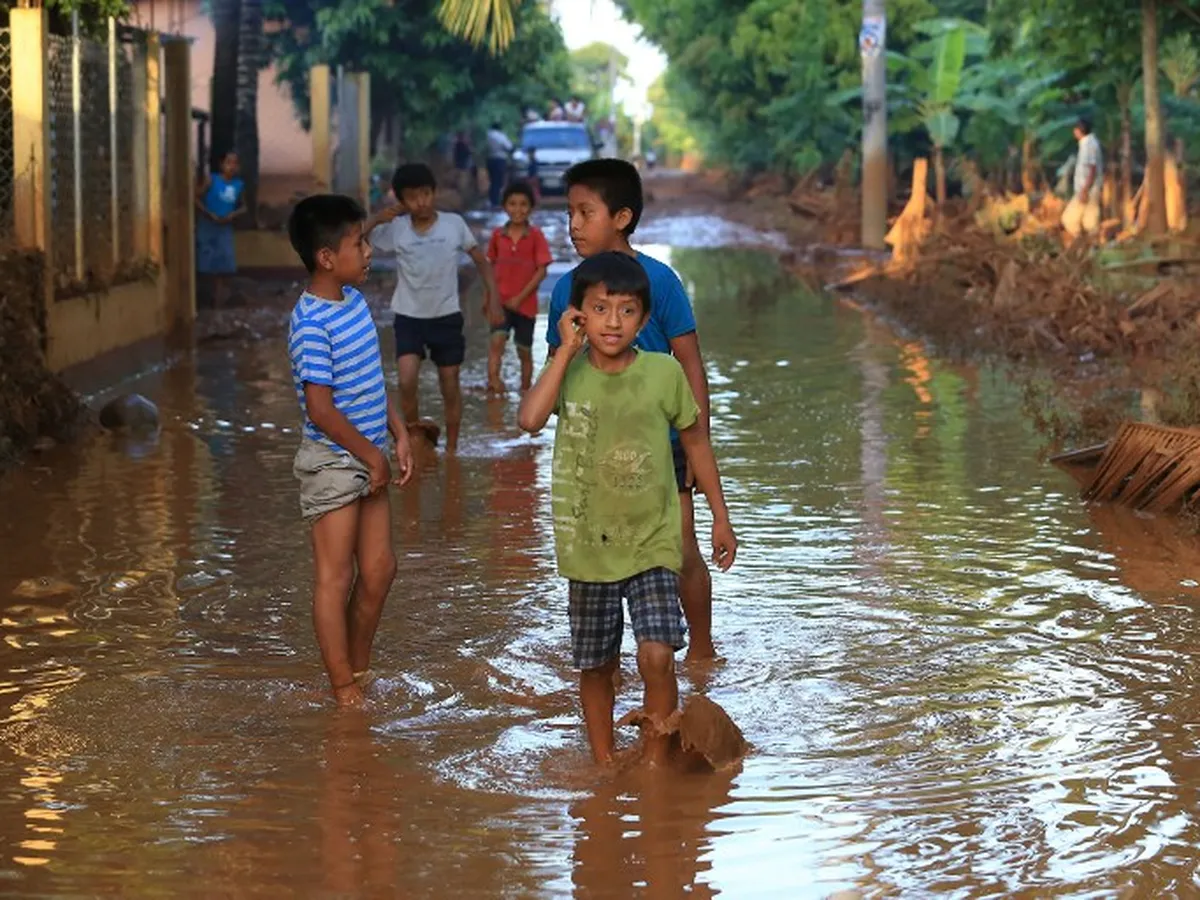 Desbordamiento del río Sumach en el departamento de Izabal, Guatemala. Al menos 3 niños han desaparecido tras lluvias que inundan el Caribe del país.