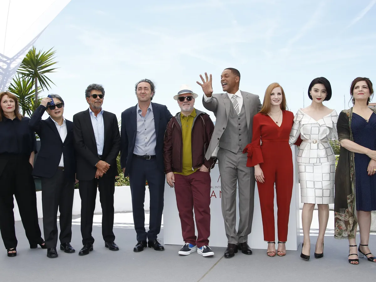 Los miembros del jurado la actriz francesa Agnes Jaoui, la actriz china Fan Bingbing, la actriz estadounidense Jessic aChastain, el actor esadounidense Will Smith, el director español Pedro Almodóvar, el director italiano Paolo Sottentino, el compositor francés Gabriel Yared, el director surcoreano Park Chan-wook y la directora alemana Maren Ade posan durante la presentación del jurado de la septuagésima edición del Festival de Cine de Cannes (Francia) hoy, 17 de mayo de 2017.