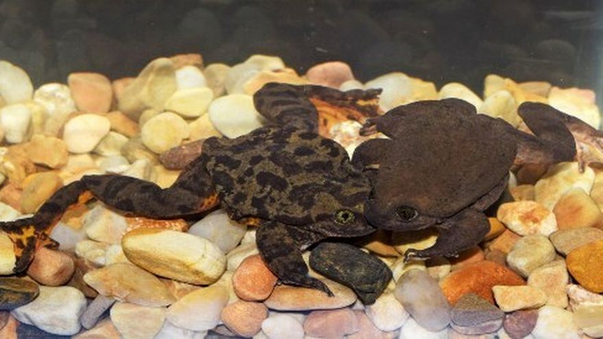 Julieta y otros cuatro ranas de Sehuencas (Telmatobius yuracare) fueron halladas en enero pasado en la región de Cochabamba y colocadas en un acuario.