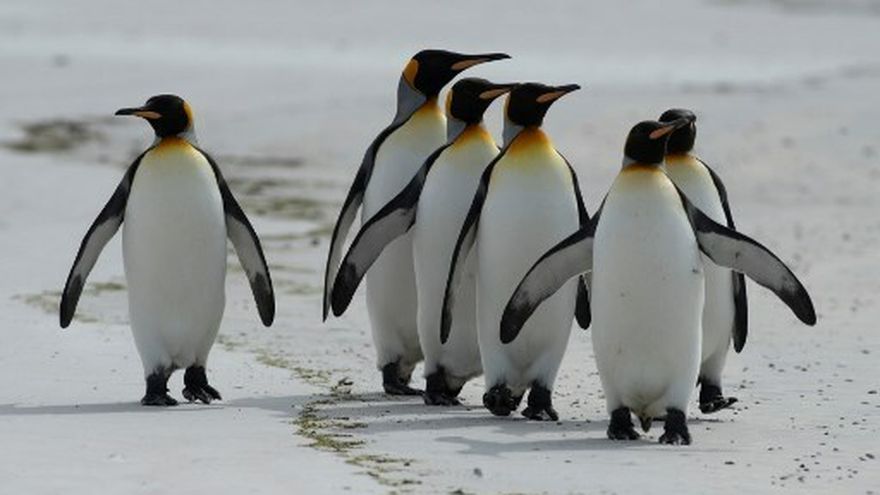 Caminando por la playa en fila india, con la cabeza en alto como en actitud altiva, los pingüinos rey son uno de los principales atractivos de la industria del turismo de las islas Malvinas.