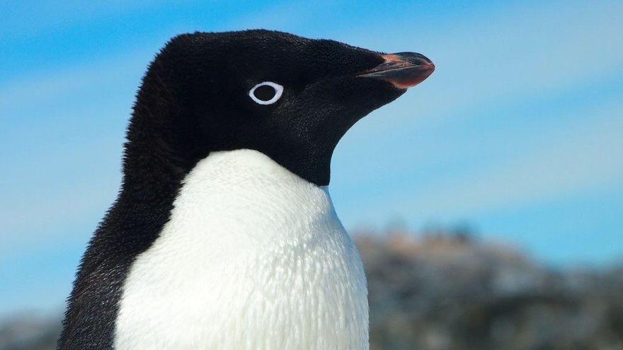 El pingüino de Adelia tiene una altura máxima de 80 centímetros y luce anillos blancos alrededor de los ojos.